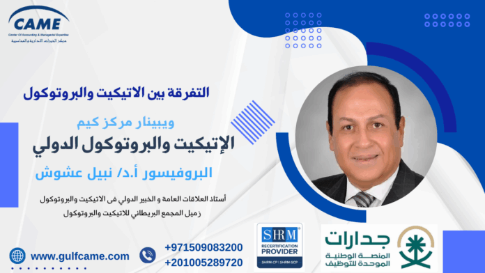 🎓 تعرف على الشهادة الاحترافية المعتمدة في الاتيكيت والبروتوكول الدولي التى يقدمها مركز كيم للتدريب مع البروفيسور نبيل عشوش سواء كنت قائدًا، مديرًا، أو صاحب عمل أو رائد للأعمال أو مهنيًا طموحًا فى العلاقات العامة أو التسويق ، أو موظف وترغب فى تطوير قدراتك ومهاراتك أو شاب أو شابة حديثة التخرج يرغب فى تحقيق النجاح فى مستقبله الشخصى أو المهني فإن فهم البروتوكول والإتيكيت الدولي هو سر من أسرار النجاح في عالم الأعمال واقامة العلاقات في المجتمع. فإن شهادة كيم الاحترافية المعتمدة في الاتيكيت والبروتوكول الدولي CAME – IEPC هى فرصتك المثالية لتطوير مهاراتك في التواصل الراقي وإدارة الاعمال والمناسبات الرسمية. مهما كانت مكانتك أو دورك، فإن الإتيكيت والبروتوكول الدولي هما المفتاح لبناء الثقة، كسب احترام الآخرين، وفتح أبواب النجاح. العلاقات المهنية والشخصية لا تعتمد فقط على ما تقول، بل على كيفية التصرف والتواصل.